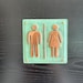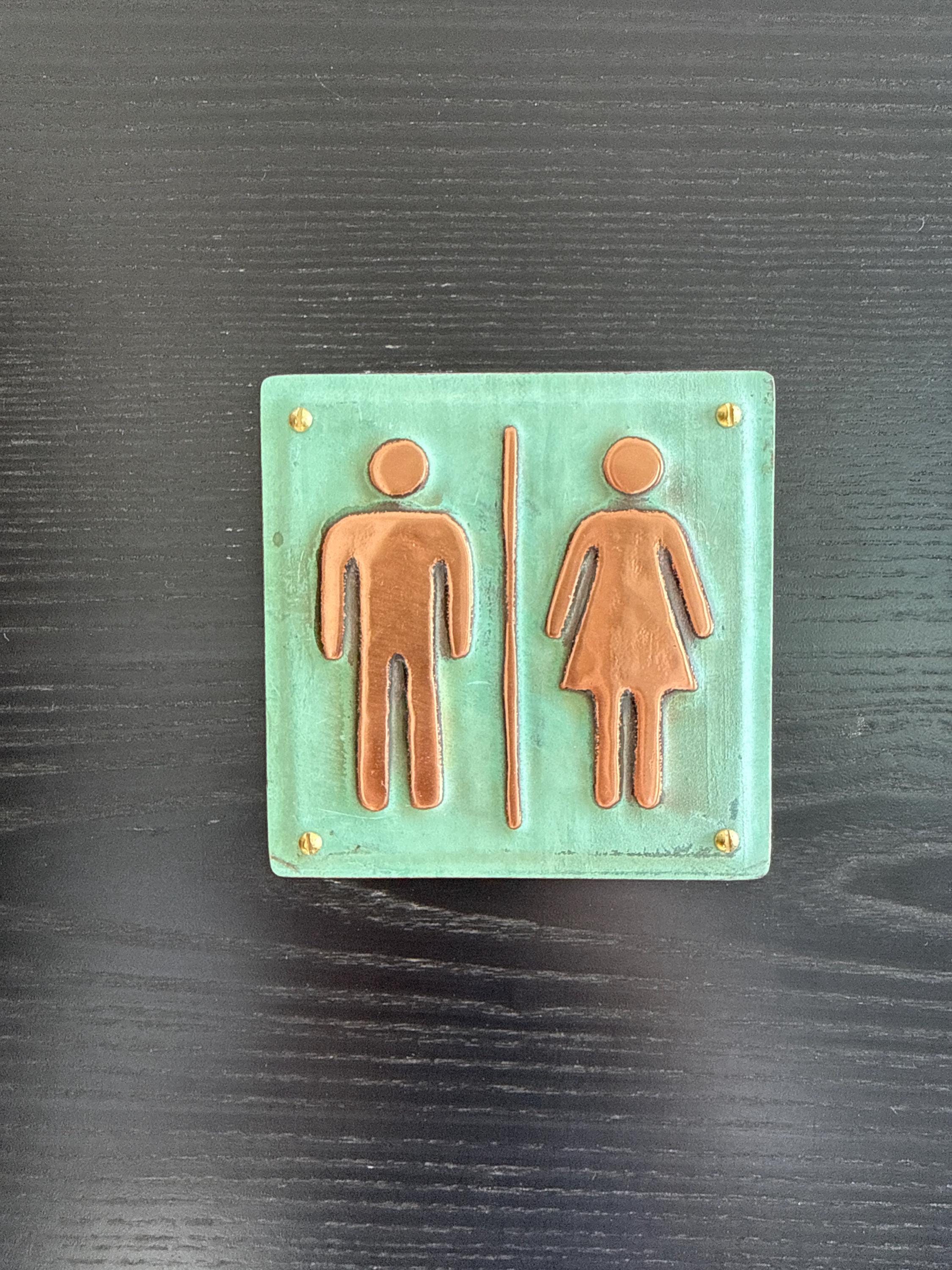Unisex washroom plaque in patinated copper