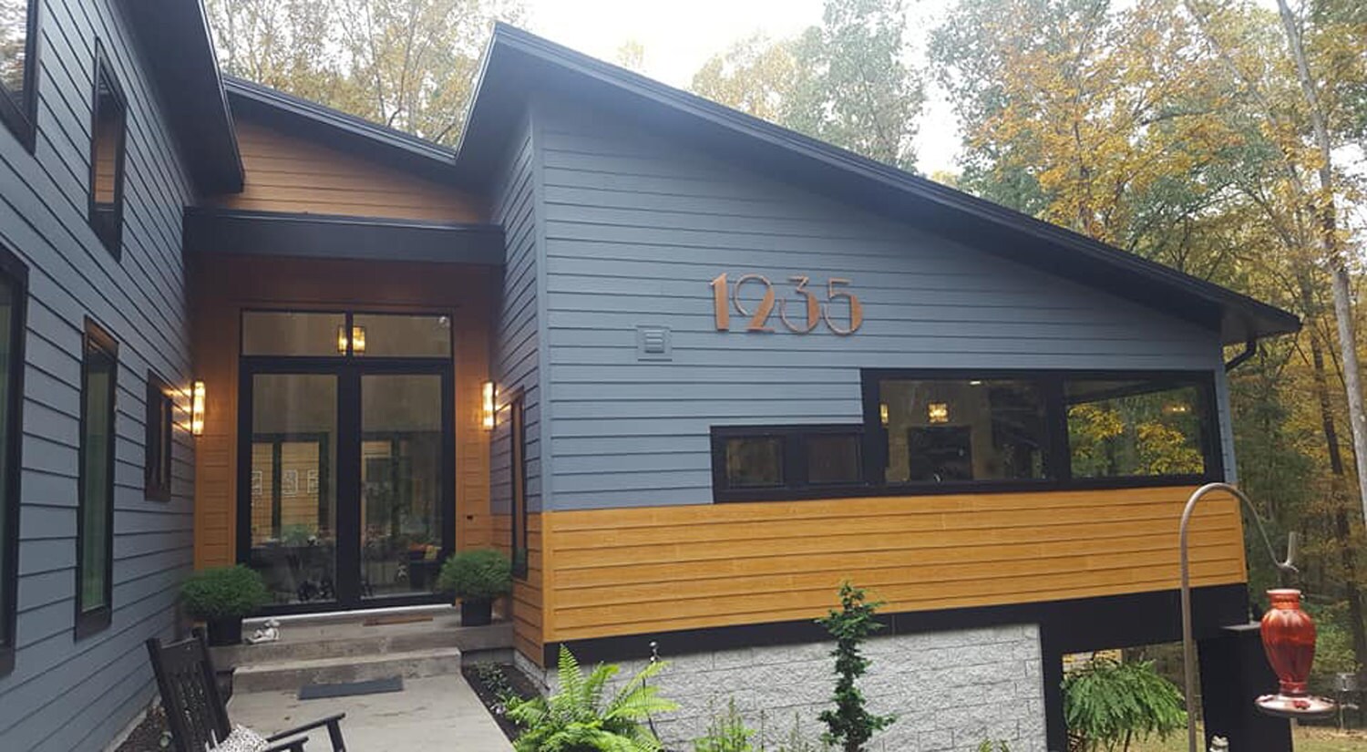1 - 6 characters in 9"/228mm high Park Lane font made from eco friendly patinated, hammered or brushed finish and lacquered copper glued to black Trespa cladding. Invisible fixing with a 15mm/5/8" standoff from the wall or wood with copper sheathed sign locators. Polished copper reflects light of course so car and street lamps will reveal your house number without illumination and electricity - an eco option ?