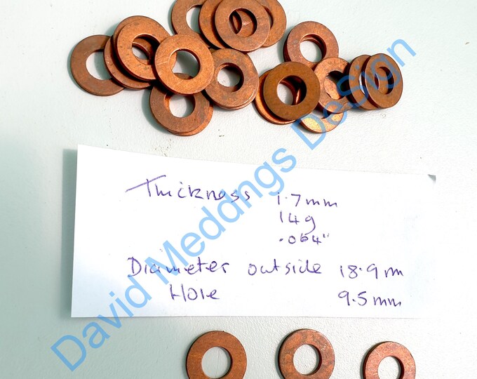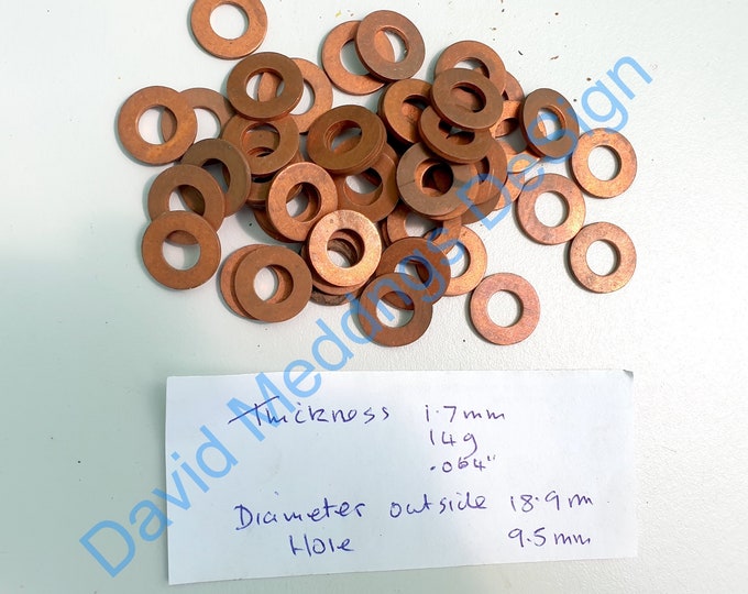 25x Copper washers blanks outside Dia. 19mm/.75" (hole 9.5mm/37") thickness 1.7mm/14g/.065"s